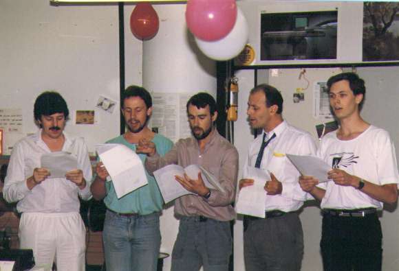 ![]() | The Fairlight acapella ensemble performing at a Christmas party; L-R: Peter Vogel, John Fletcher, Quentin Goldfinch, Andrew Bell, Andrew Bettison. In the twilight years of the company, this group named itself "The Fairlight Flangers in Decay". |